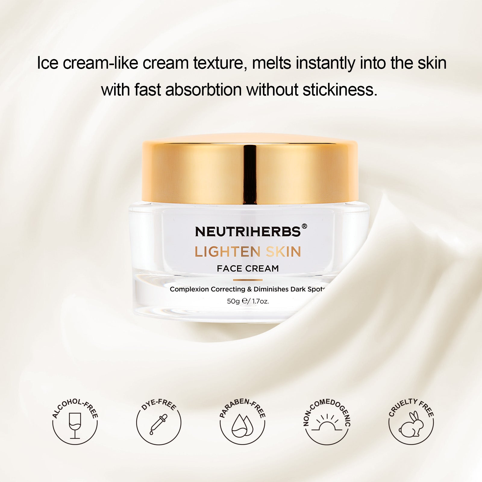 Neutriherbs lightening skin face cream provides a multi-faceted approach to lightening skin and to the prevention of dark spots and dull skin and achieves results quickly. It supports the process of natural surface cell turnover and visibly reduces dullness & dark spots. It improves the look of your skin’s tone, texture, and fine lines for lighter, more even-looking skin.